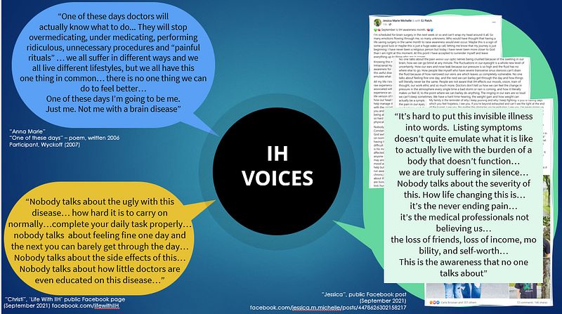 Drawing on data from an online qualitative survey and asynchronous, Facebook-mediated research discussion group, this research offers diverse, global perspectives from 563 adults with IH. The findings demonstrate that IH impacts "literally everything," with experiences extending far beyond clinical interpretations focused primarily on headache and vision. People with IH navigate a complex borderlands between medical and lived perspectives, and demonstrate how they manage their dynamic disability through contextually and relationally specific contexts. The collective experience of IH, characterised by omnipresent uncertainty, and significant negative sentiment, often generates a state of illbeing. The research demonstrates how people with IH develop nuanced forms of embodied knowledge through knowledge sharing and collective expertise-building within online communities, particularly on Facebook, that both expands and challenges the existing medicalised framework.